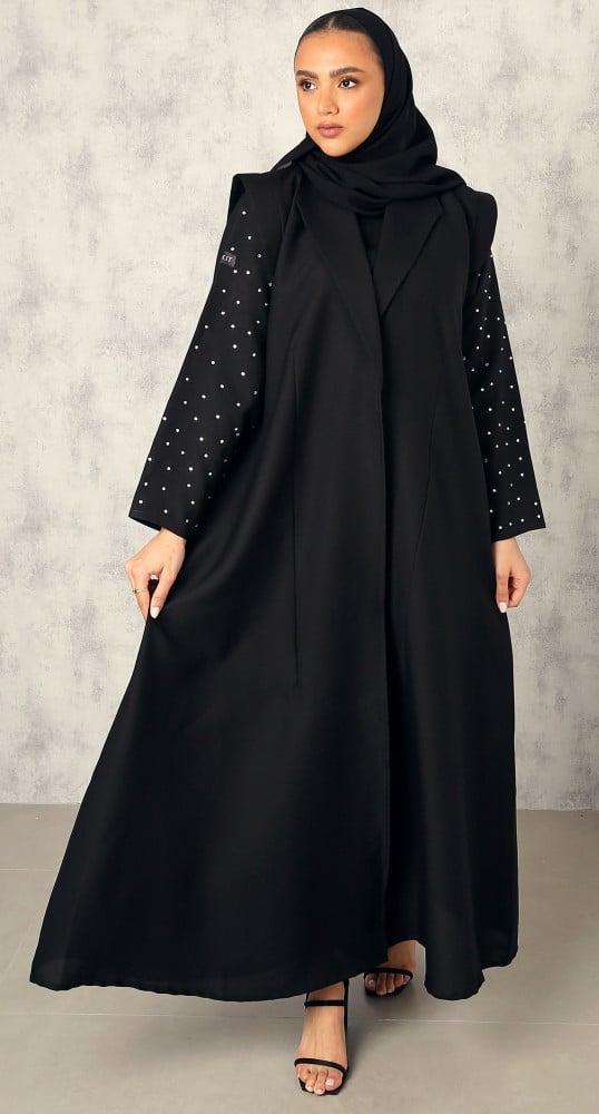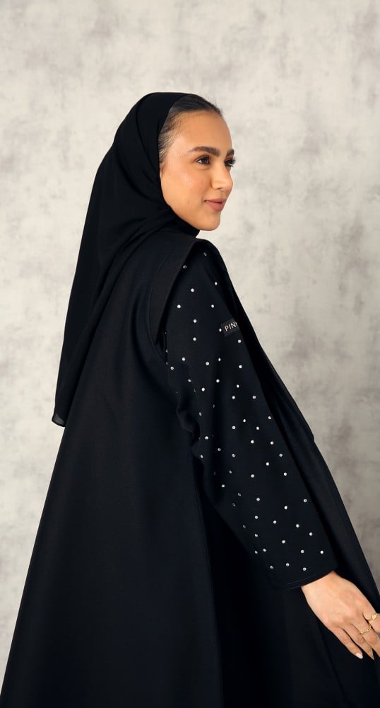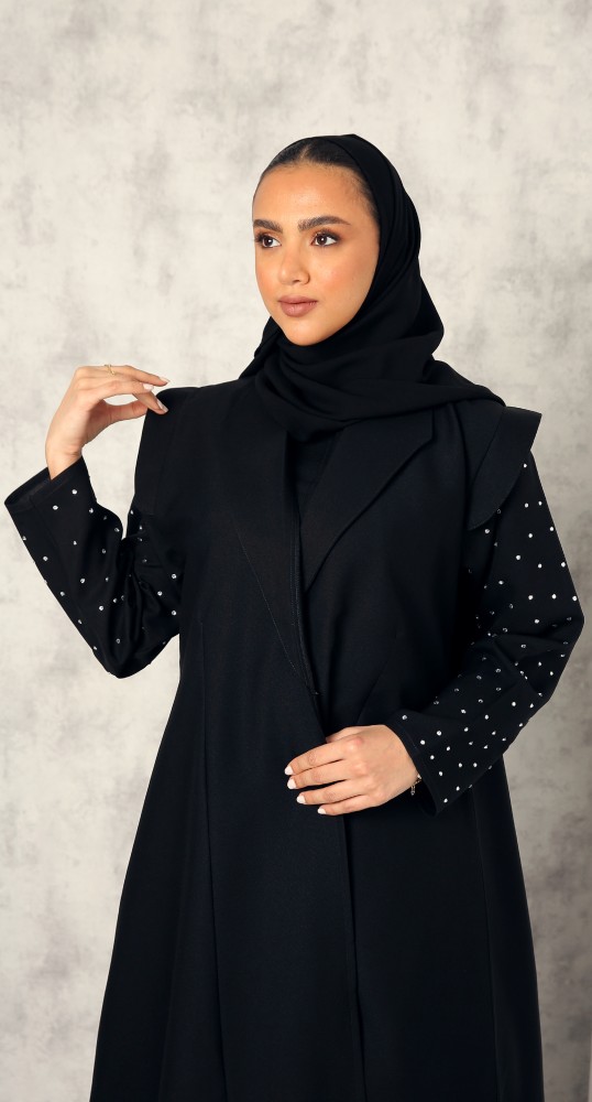 عباية أنيقة كلاسيكية بياقة أمامية مصممة باللون الأسود الفاخر من خامة الكتان. درجة السواد ملكية فاحمة. القماش بارد معتدل الثقل. قصة العباية على شكل معطف، أكتاف العباية مزينة بحركة أنيقة. الأكمام مزينة بكريستال أبيض ناعم. تصاحبها طرحة سوداء.