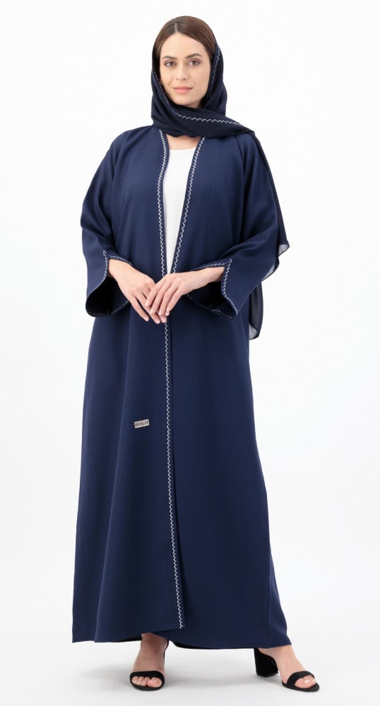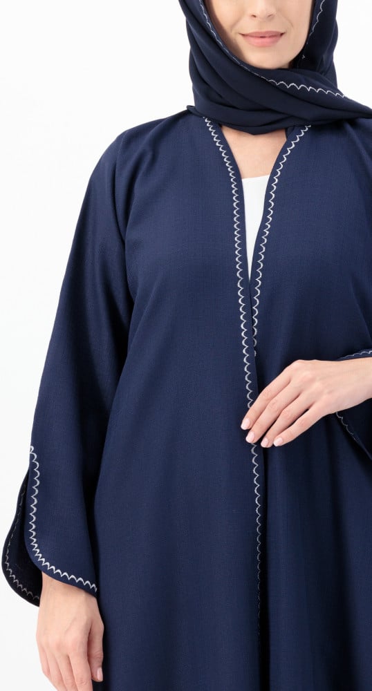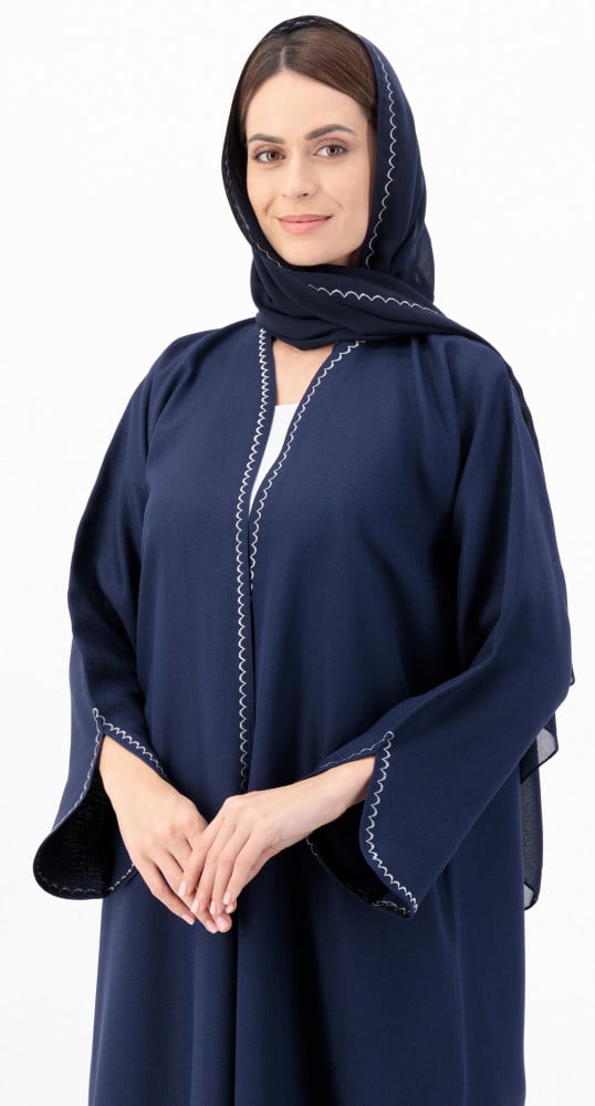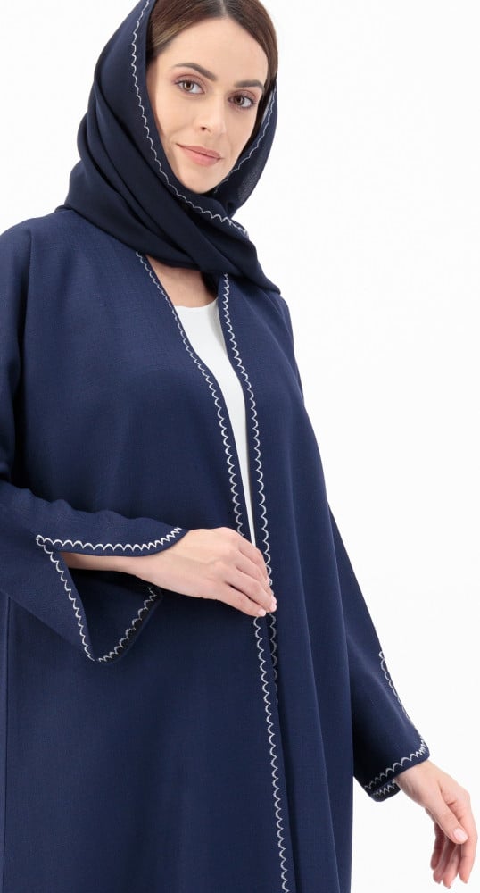 عباية كحلية بتصميم مبتكر، ذات إطلالة جذابة وأنيقة. القماش كحلي من الدرجة الأولى. تتفرد العباية بـ كم أنيق وتصميم انسيابي. العباية مطرزة بتطريزات انسيابية على شكل أقواس من أعلى إلى أسفل من الأمام وكذلك عند الأكمام. الطرحة كحلية متناسقة بنفس التطريزات الرائعة والجذابة.