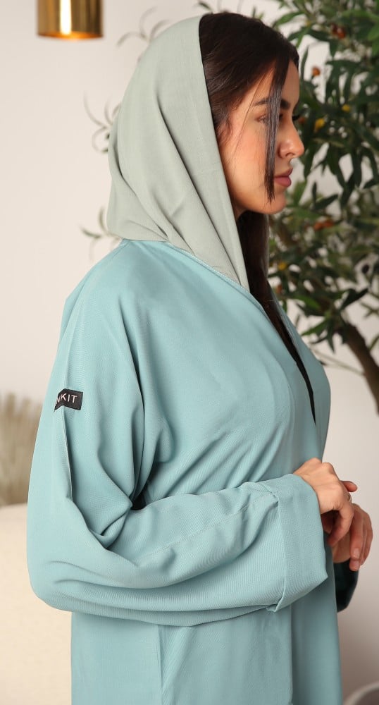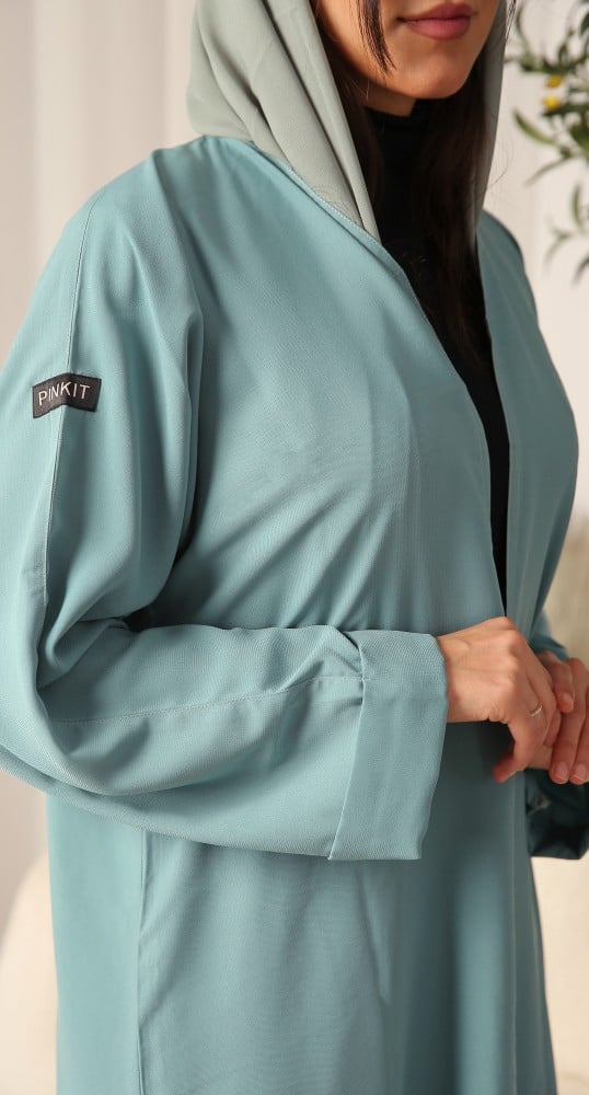 إطلالة مليئة بالفخامة، عباية عملية كلاسيكية مصممة لتلائم إطلالتك اليومية و تمنحك الشعور بالأناقة. العباية باللون التيفاني من خامة الكريب الياباني المريحة والباردة. الأكمام كلاسيكية واسعة مثنية. تصاحبها طرحة متناغمة باللون زيتي هادئ.