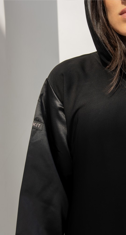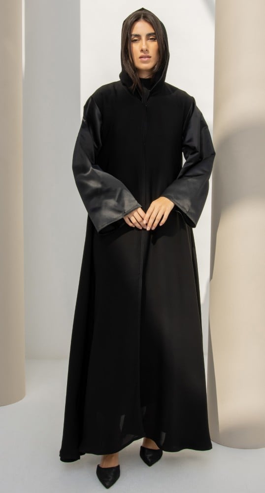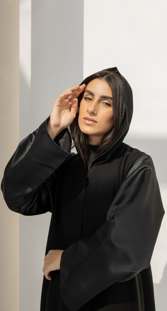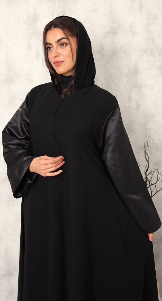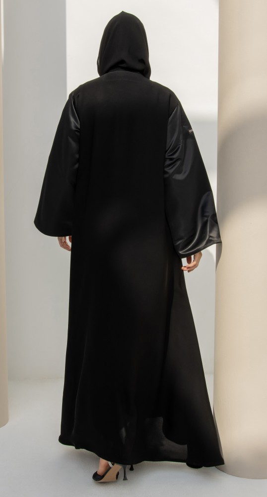 عباية كلوش كلاسيكية متناسقة من خامة الانترنت الفاخرة. أكمام العباية من خامة التفتة الفرنسية باللون الأسود الفاحم. العباية مقفلة بطقطق. تصاحبها طرحة سوداء مماثلة للصورة.